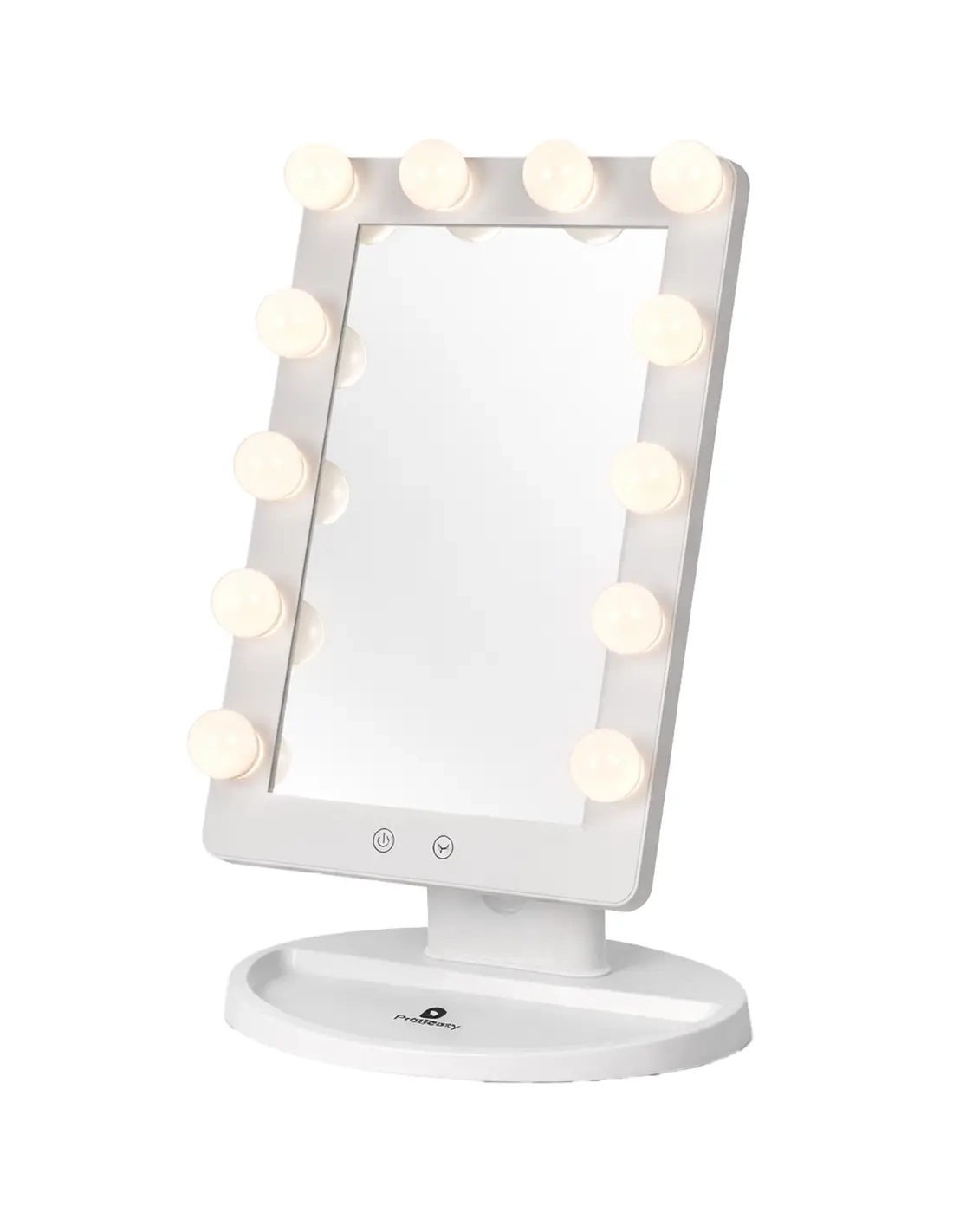 Espejo de maquillaje eléctrico con ángulo de inclinación ajustable hasta 25°. Diseñado para ofrecer una iluminación precisa y uniforme gracias a sus 12 bombillas LED de larga duración y bajo consumo.