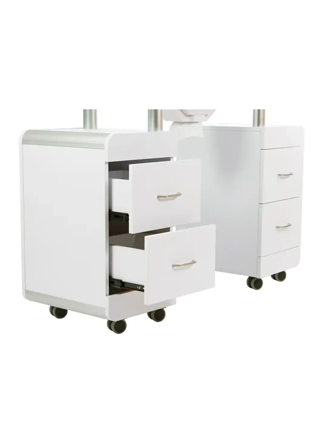 La mesa de manicura PEZI de Weelko es una estación profesional en madera contrachapada blanca con diseño moderno. Incorpora encimera y estanterías de cristal templado para una superficie elegante y fácil de limpiar, doble columna con cajones y ruedas con freno para moverla y fijarla con seguridad en cabina.