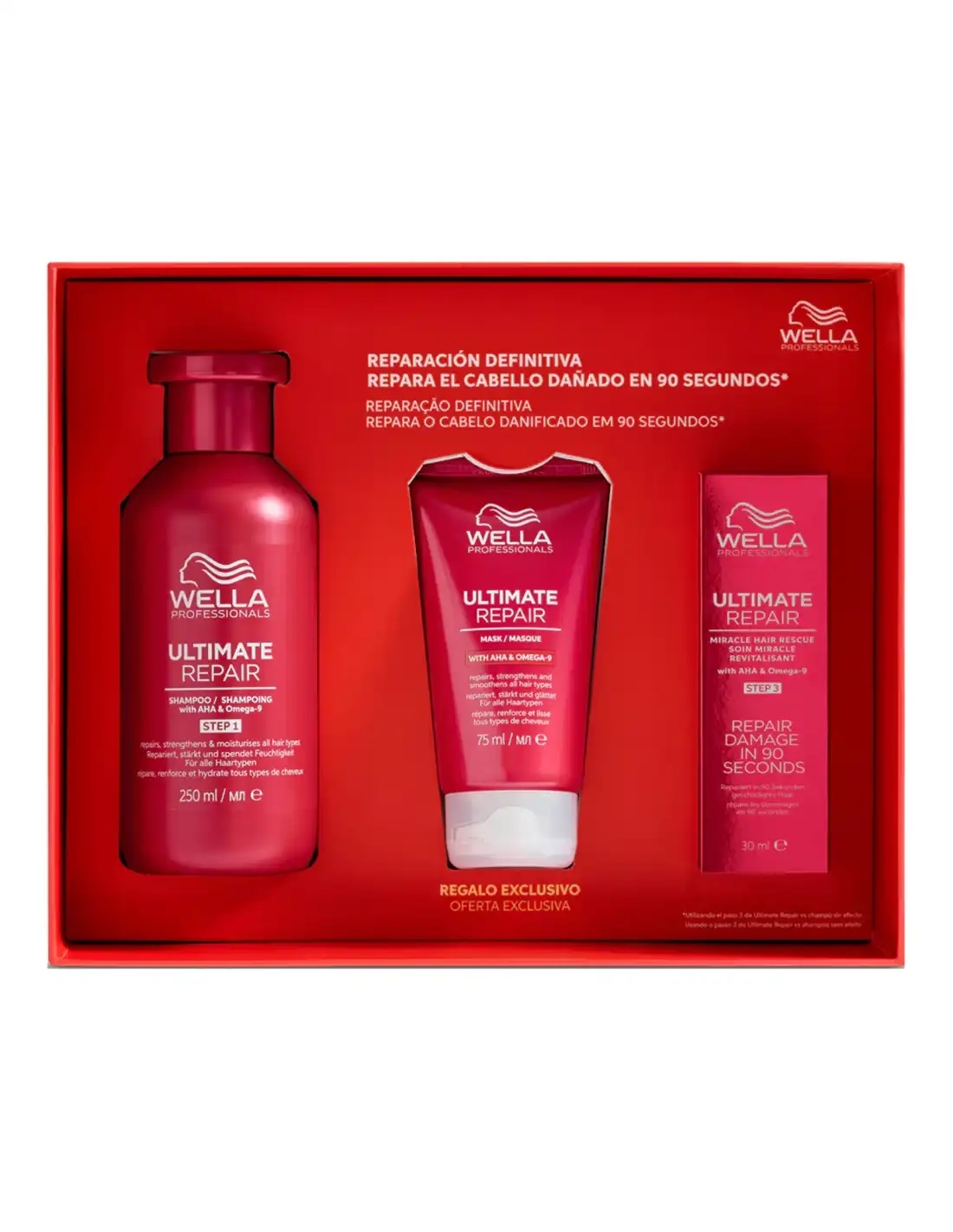 La Rutina Profesional de Reparación Definitiva combina tres potentes productos de la línea Ultimate Repair para ofrecer una reparación intensiva y resultados visibles desde la primera aplicación. Su innovadora fórmula con AHA, Omega-9 y tecnología Metal Purifier repara el cabello dañado en tan solo 90 segundos, dejándolo más fuerte, suave y con un brillo saludable. Apta para todo tipo de cabellos.