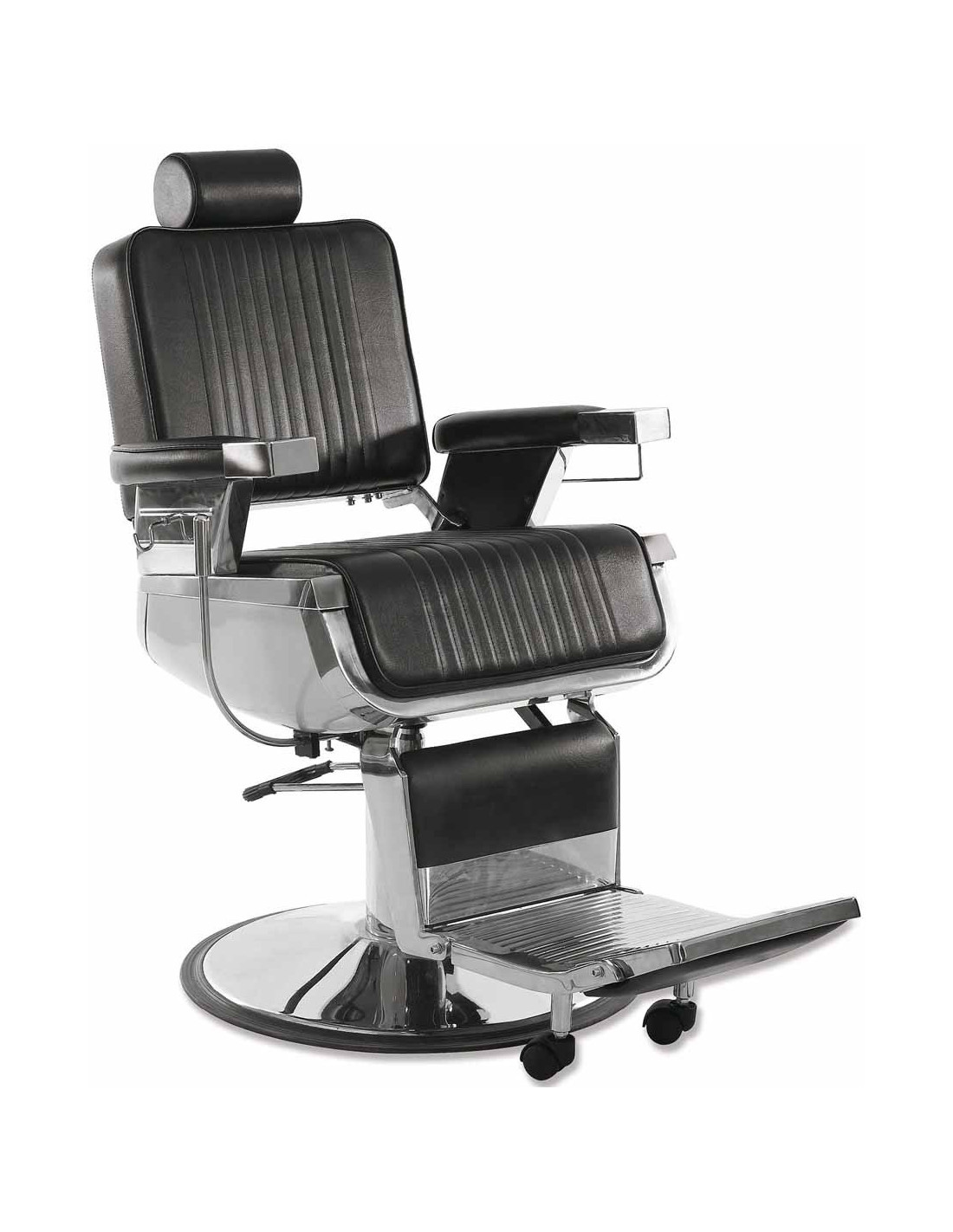 Sillón de barbería modelo vintage. Robusto. Tapizado en poli piel con espuma de alta densidad. Mecanismo de elevación hidráulico con freno y bloqueo. Estructura de los brazos cromad con superficie tapizada. Embellecedores de poliestileno blanco e inox. Cabezal extraible. Apoyapies inox reversible, convertible en apoya piernas.