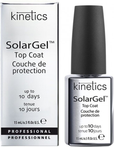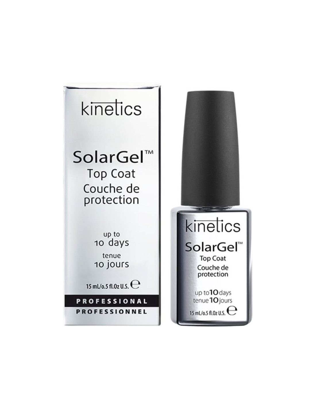El top coat Solar Gel de Kinetics asegura una duración de hasta 10 días en las uñas esmaltadas con el sistema Solar Gel. Aporta un brillo extraordinario y una durabilidad de hasta 10 días.